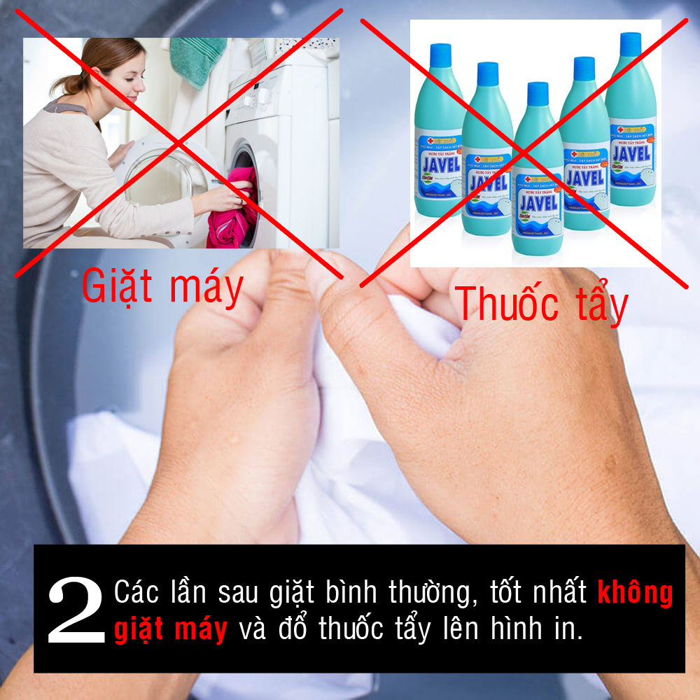 2. Các lần giặt sau bạn giặt bình thường, tốt nhất không giặt bằng máy, tuyệt đối không đổ xà phòng và thuốc tẩy trực tiếp vào hình in.